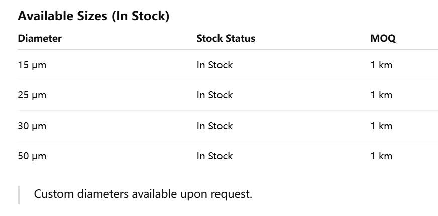 • Η αποθήκη μας έχει ήδη αποθέματα.Υπερτελή νήματα βολφραμίουμε διάμετρο μεταξύ15 μm έως 50 μm, διαθέσιμα για ταχεία παράδοση.ελάχιστη ποσότητα παραγγελίας μόνο 1 km, το σύρμα βολφραμίου μας είναι ιδανικό για πελάτες που απαιτούνΠρομήθεια μικρών παρτίδων,Δοκιμές Ε&Α, ήσταθερή μακροπρόθεσμη προμήθεια.